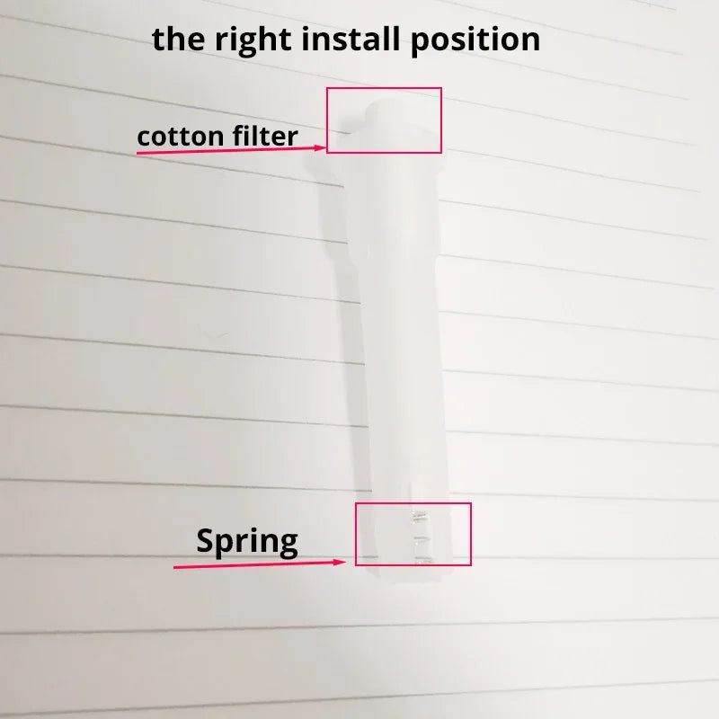the correct position is :1,please install the spring is under the cotton filter (as the picture below ), which is to make sure the cotton filter to connect the nozzles well .