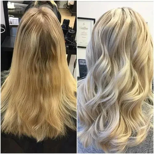 鮮やかな紫色のシャンプーが黄ばみ(ブラス)を中和し、クールなアッシュトーンやシルバーの色味を引き立てます。