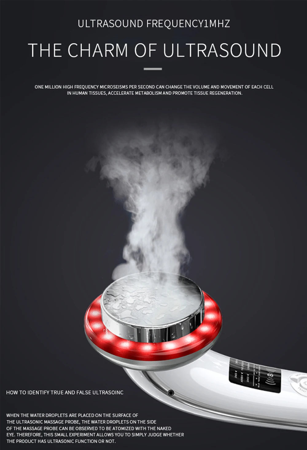 超音波マッサージプローブの表面に水滴を置くと、水滴が目に見える形で霧化(ミスト状)になります。この簡単な実験で、製品に超音波機能があるかどうかを判断できます。