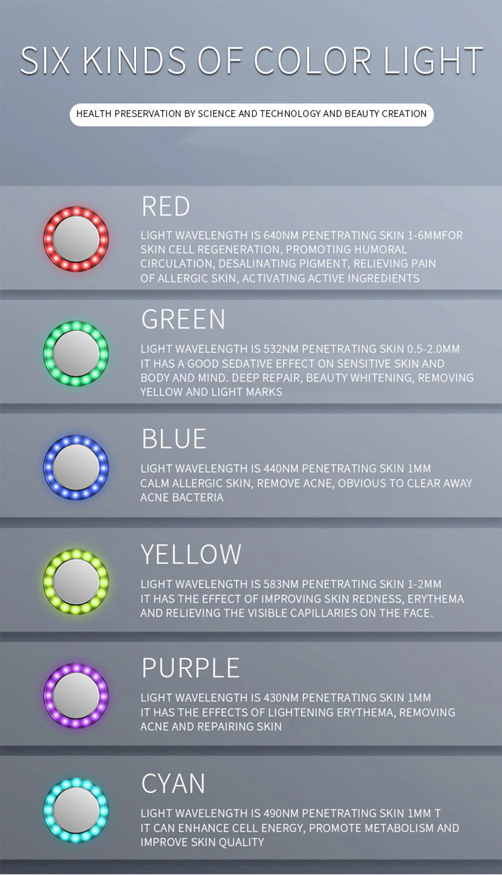 緑色光(532nm) 0.5〜2mm浸透。鎮静、美白、深層修復。